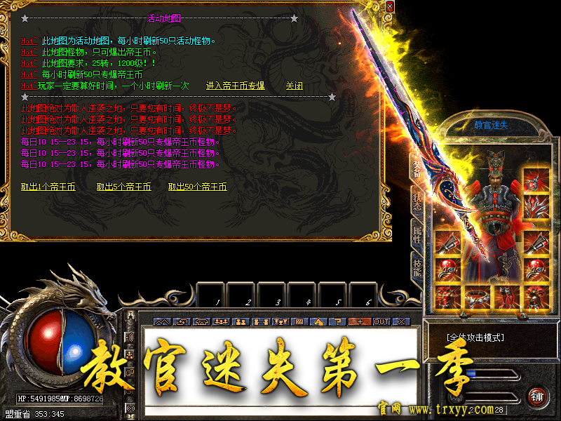 1.【充值比例】每充值1元系统赠送:100万元宝+5个帝王币+1充值点----测试期间冲值开区后多送20%!!